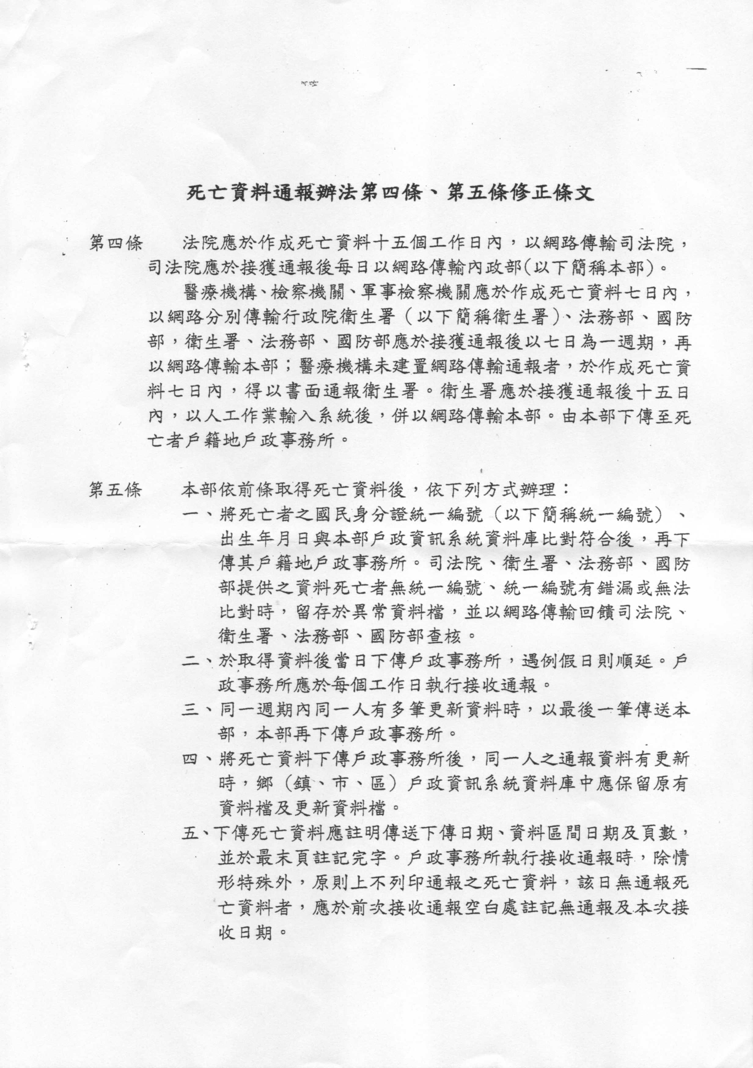 ‧{政令}「死亡資料通報辦法」第4條,第5條修正條文